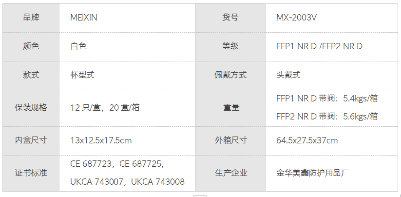 MEIXIN防护口罩(带阀款) FFP1 NR D/FFP2 NR D MX-2003V